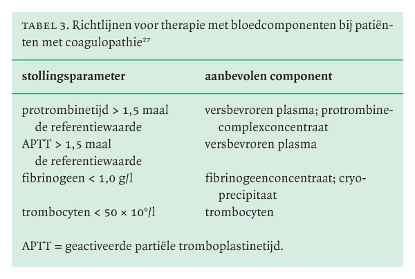 De richtlijnen voor therapie met bloedcomponenten, zoals ook voorgesteld door de American Society of Anesthesiologists Task Force on Blood Component Therapy, zijn samengevat in tabel 3.27 Deze richtlijnen zijn echter niet evidence-based en berusten op de mening van experts. Recent deden Frölke et al. in het Tijdschrift een voorstel voor een ‘blind’ transfusiebeleid bij patiënten met acuut, ernstig bloedverlies.28