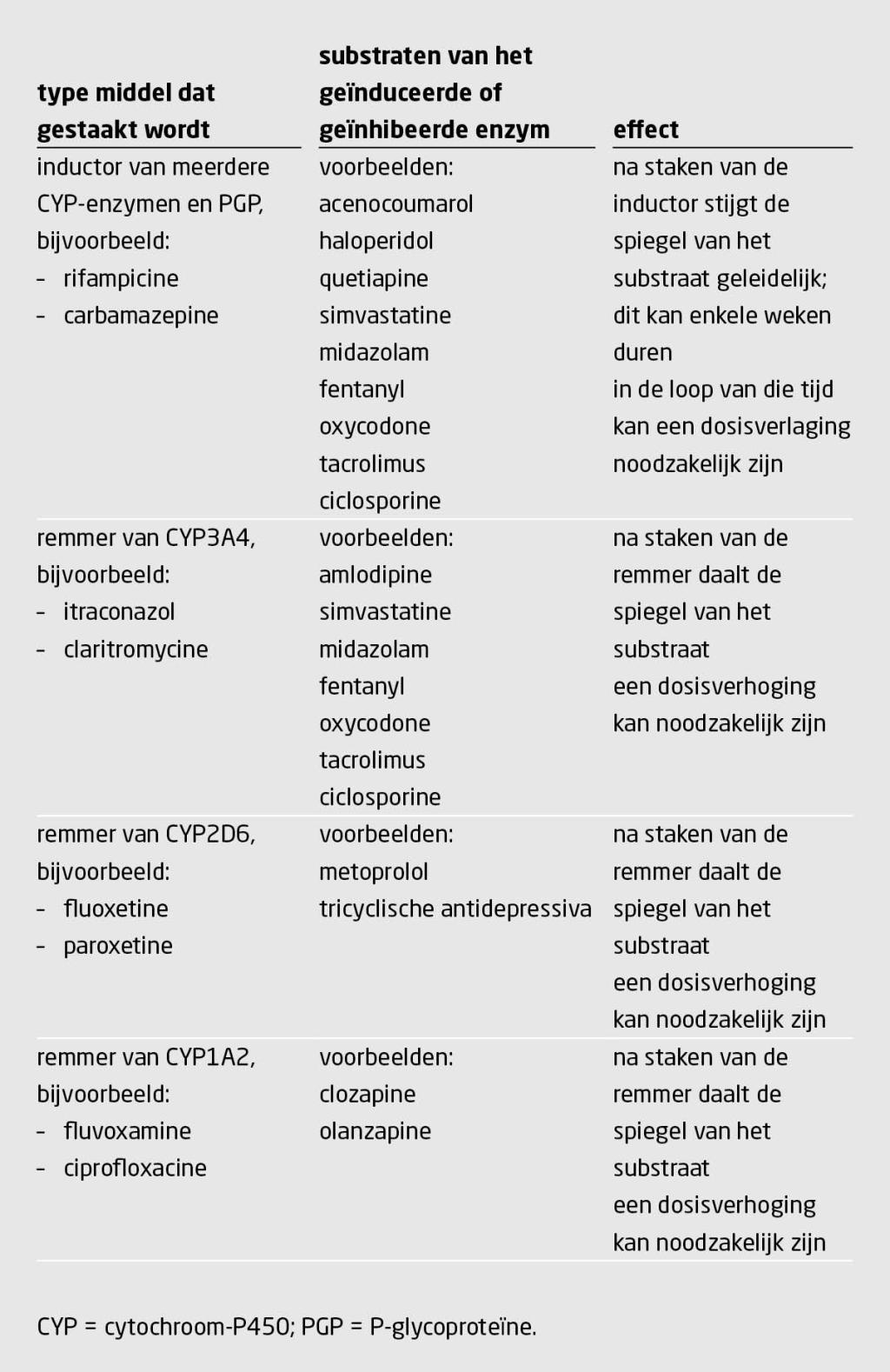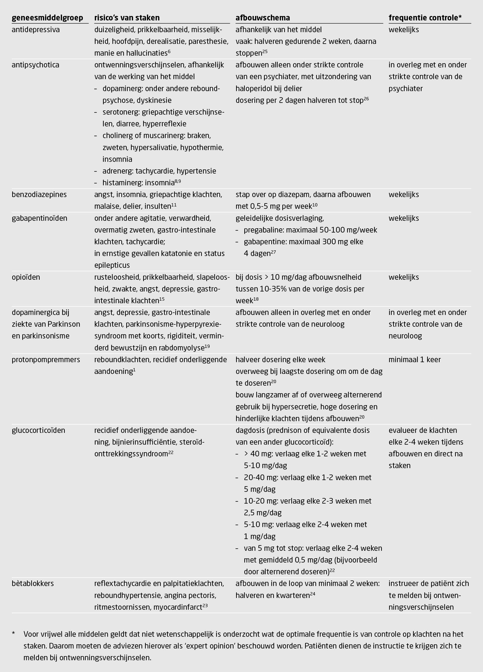 • Middelen met een aangrijpingspunt in het centrale zenuwstelsel, zoals psychofarmaca, parkinsonmiddelen en analgetica, zijn berucht om het optreden van klachten na het staken. Bètablokkers, glucocorticoïden en protonpompremmers geven eveneens een risico op terugkeren van de oorspronkelijke klachten en ontwenningsverschijnselen.