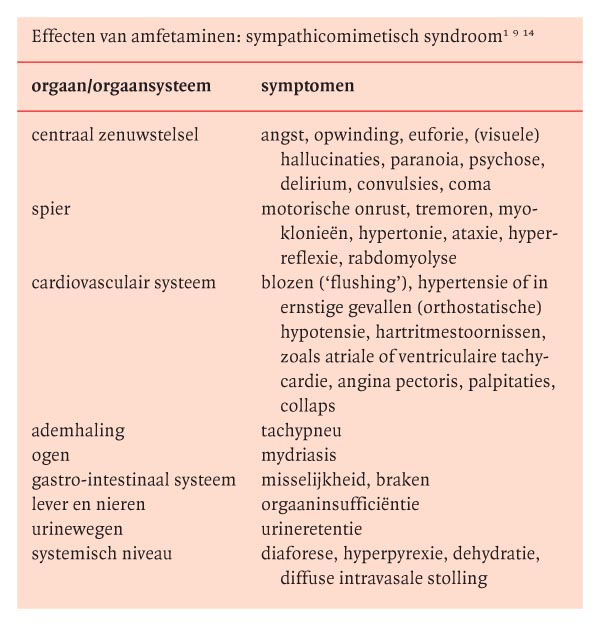 Bij een accidentele of intentionele intoxicatie met methylfenidaat kan het zogenaamde sympathicomimetisch syndroom optreden. De verschillende symptomen die zich hierbij voordoen, zijn weergegeven in de tabel.1 9 14 Een methylfenidaatintoxicatie kan letaal verlopen. Zo is een fataal beloop gerapporteerd na inname van methylfenidaat in een dosis van 5 mg/kg.3 De beschreven patiënt zou meer dan 1000 mg hebben ingenomen, hetgeen overeenkomt met tenminste 12 mg/kg. Misbruik van methylfenidaat geschiedt ook wel via de intranasale en intraveneuze route, met alle gevaren van dien.1 7 15