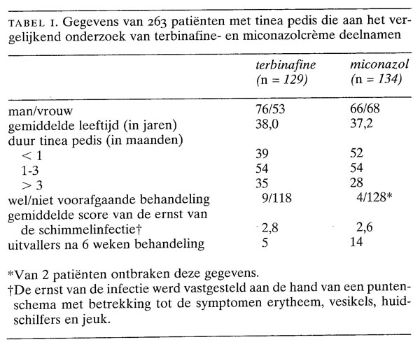De huisartsen selecteerden 471 patiënten, van wie 263 een positief direct preparaat op schimmels hadden. Deze patiënten wilden behandeling ontvangen en werden als de uitgangspopulatie beschouwd. Van deze 263 patiënten werden 129 patiënten ingedeeld in de groep die met terbinafinecrème en 134 patiënten in de groep die met miconazolcrème werd behandeld. De beide therapiegroepen waren goed vergelijkbaar wat betreft leeftijd, geslacht, ras, duur van de schimmelinfectie, wel of niet voorafgaande behandeling en de ernst van de schimmelinfectie (tabel 1).