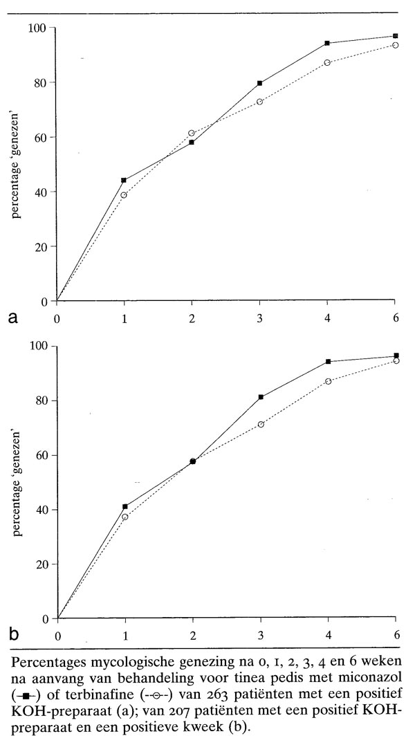 Patiënten die de huisarts bezochten vanwege tinea pedis en een positief KOH-preparaat voor een schimmelinfectie hadden, werden behandeld met terbinafinecrème gedurende 1 week, gevolgd door placebo gedurende 3 weken, of met miconazolcrème gedurende 4 weken. Evaluatie vond plaats na 1, 2, 3, 4 en 6 weken na het starten van de therapie. Mycologische genezing was gedefinieerd als de aanwezigheid van een positief KOH-preparaat en een positieve kweek voor de behandeling met een negatief resultaat op beide na de behandeling. Klinische effectiviteit was gedefinieerd als mycologische genezing en de aanwezigheid van maximaal twee geringe symptomen (erytheem, vesikels, huidschilfers, jeuk) ter plaatse van de aanvankelijk ernstigste huidafwijking. Resultaten zijn geevalueerd van alle patiënten met een positief KOH-preparaat en van de patiënten met een positief KOH-preparaat en een positieve kweek.