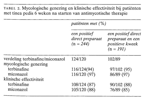 De klinische effectiviteit en de mycologische genezing waren op ieder moment van evaluatie (1, 2, 3, 4 en 6 weken na het starten van de therapie) niet statistisch verschillend bij beide behandelingsprotocollen. Bij evaluatie 6 weken na de start van de antimycotische therapie van de gehele patiëntenpopulatie van 263 met een positief direct preparaat en bij evaluatie van alleen de populatie van 207 patiënten met ook een positieve kweek, was er geen statistisch significant verschil tussen de beide therapiegroepen (figuur). De behandelingsresultaten bij patiënten met T. mentagrophytes-infectie waren hetzelfde als die bij patiënten met T. rubrum-infectie. Zes weken na het starten van de therapie waren de mycologische genezing en de klinische effectiviteit hetzelfde in beide therapiegroepen (tabel 2).