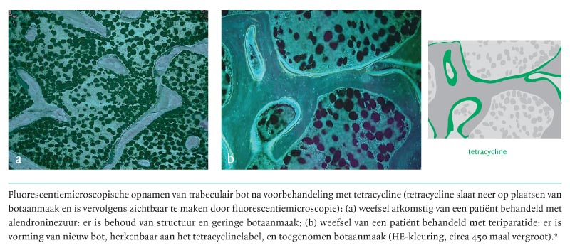 In een vergelijkende studie werd het effect van alendroninezuur vergeleken met dat van teriparatide 40 ?g.17 In de teriparatidegroep bleek de toename van de BMD in de lumbale wervels aanzienlijk hoger: 12 versus 6. Ook was de toename van de BMD in de heup en het hele skelet hoger in de teriparatidegroep, maar niet in de distale radius, waar de BMD meer steeg in de alendroninezuurgroep. De incidentie van niet-vertebrale fracturen in de teriparatidegroep was significant lager dan in de alendroninezuurgroep: 4,1 versus 13,7 (p
