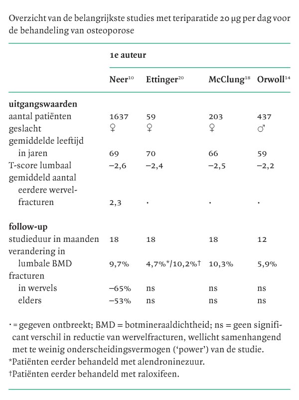 In een dubbelblind, placebogecontroleerd, gerandomiseerd onderzoek (n = 1637) toonden Neer et al. de effectiviteit van subcutaan toegediend teriparatide aan bij vrouwen die tenminste 5 jaar in de menopauze waren.10 De vrouwen hadden gemiddeld 2,3 wervelfracturen en een gemiddelde T-score van –2,6 bij het begin van het onderzoek (de T-score is het aantal standaarddeviaties verschil met de gemiddelde botmineraaldichtheid (BMD) van jonge volwassenen, de piekbotmassa).10 In dit onderzoek werd na 18 maanden behandeling een belangrijke toename van de BMD van de lendenwervels van 9,7-13,7 (afhankelijk van de dosering) geobserveerd.10 Na 18 maanden behandeling was het percentage vrouwen met nieuwe wervelinzakkingen 15, 5 en 4, respectievelijk in de placebogroep en in de groepen die met (dagelijkse) teriparatide-injecties met 20 en 40 ?g werden behandeld. Dit komt overeen met een relatief risico (RR) van 0,35 (95-BI: 0,22-0,55) en 0,31 (95-BI: 0,19-0,50), oftewel een vermindering van het fractuurrisico van respectievelijk 65 en 69. De reductie van het risico van nieuwe, ernstige wervelfracturen bleek na 18 maanden zelfs met 90 gedaald te zijn bij de groep die met teriparatide 20 ?g werd behandeld.11