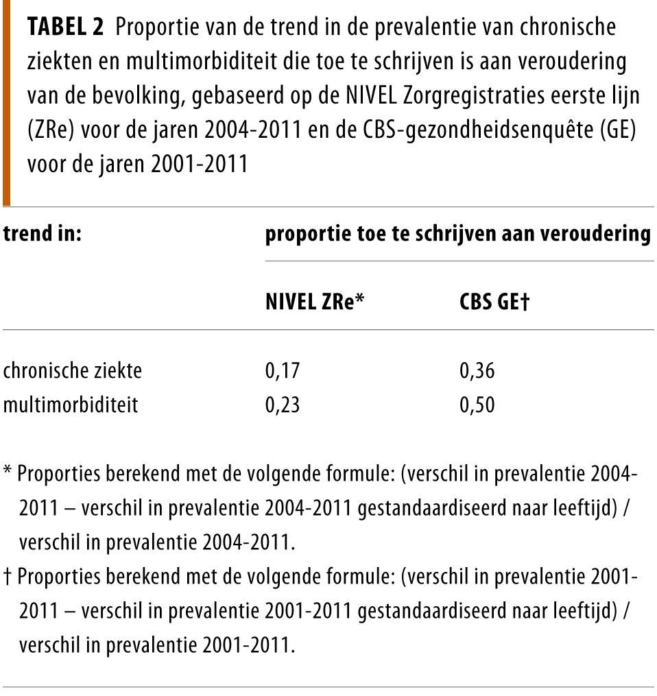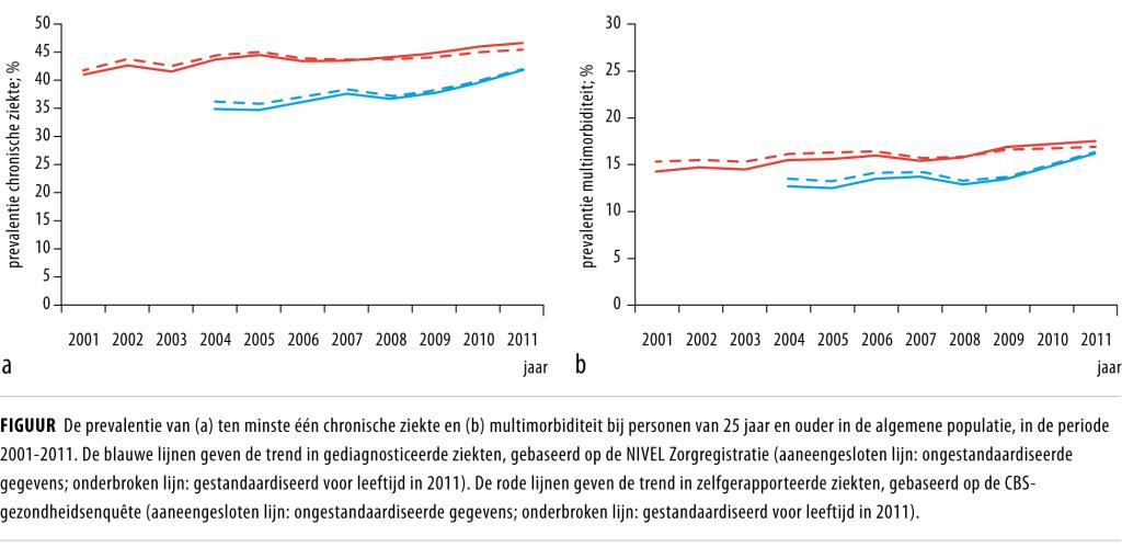 De prevalentie van chronische ziekten nam op basis van de huisartsgegevens toe van 34,9% in 2004 naar 41,8% in 2011 en op basis van de gezondheidsenquête van 41,0% in 2001 naar 46,6% in 2011. Ook de prevalentie van multimorbiditeit steeg, respectievelijk van 12,7% in 2004 naar 16,2% in 2011 en van 14,3% in 2001 naar 17,5% in 2011. Veroudering van de bevolking verklaart ongeveer een vijfde deel van deze stijging in de huisartsenpraktijken en een derde tot de helft in de gezondheidsenquête.