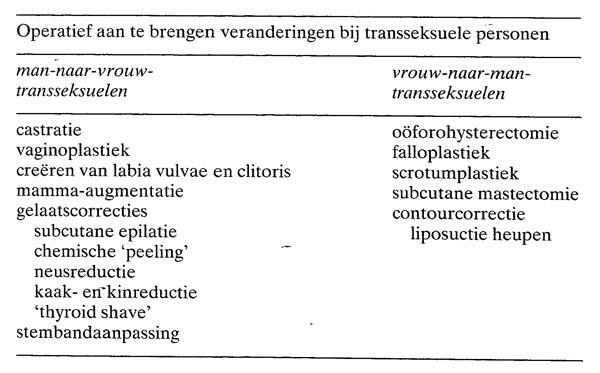 De chirurgische behandeling is onder te verdelen in de orchidectomie of de oöforohysterectomie, de verandering van uitwendige primaire kenmerken en eventueel de chirurgische aanpassing van secundaire geslachtsken merken (tabel). Uitgangspunt voor zowel de patiënt als de chirurg daarbij is dat de anatomie en de functie van het gewenste geslacht optimaal worden benaderd.12