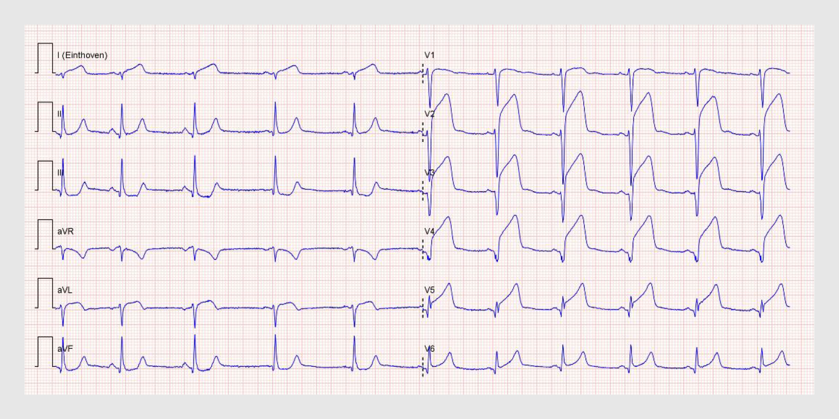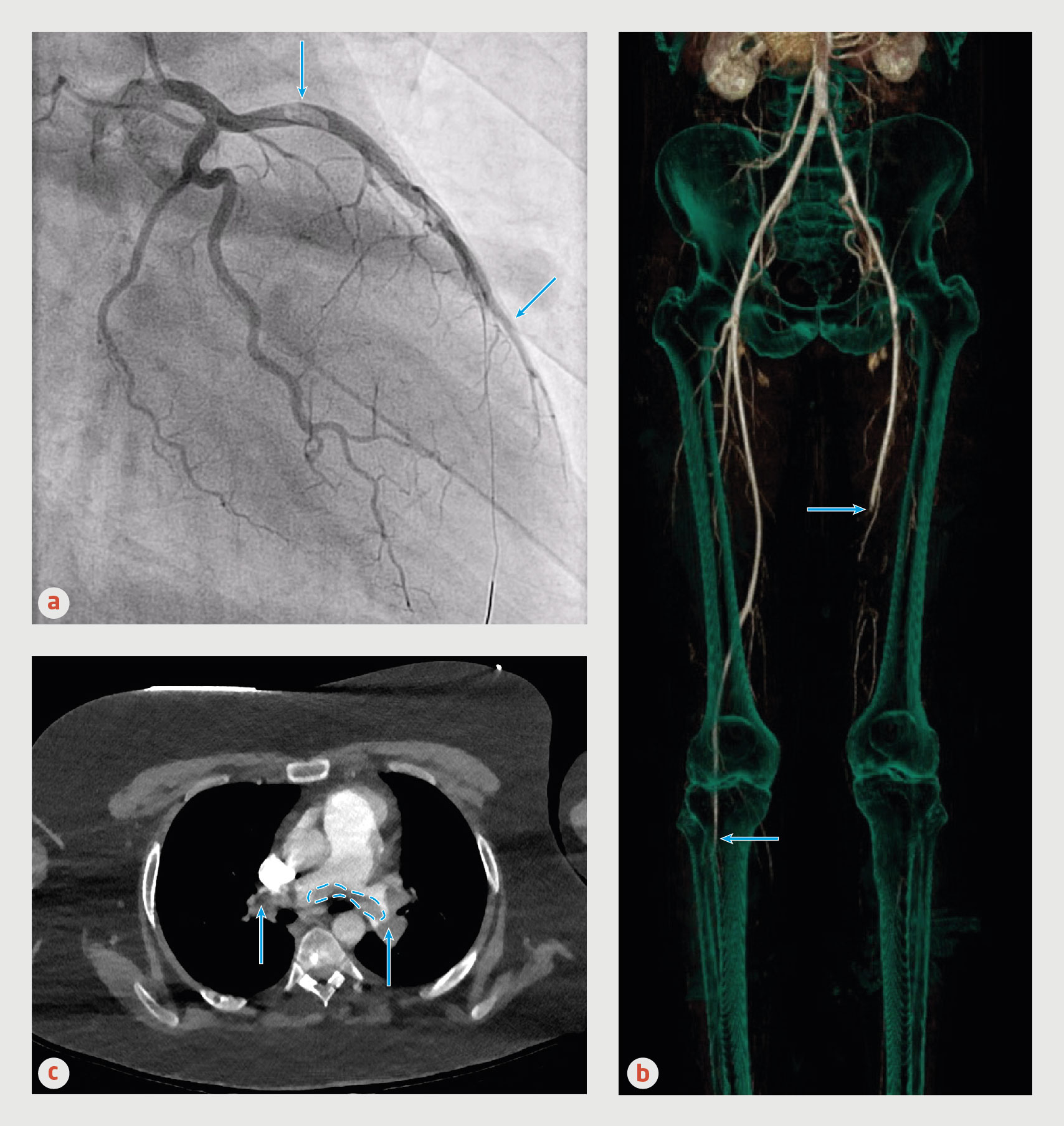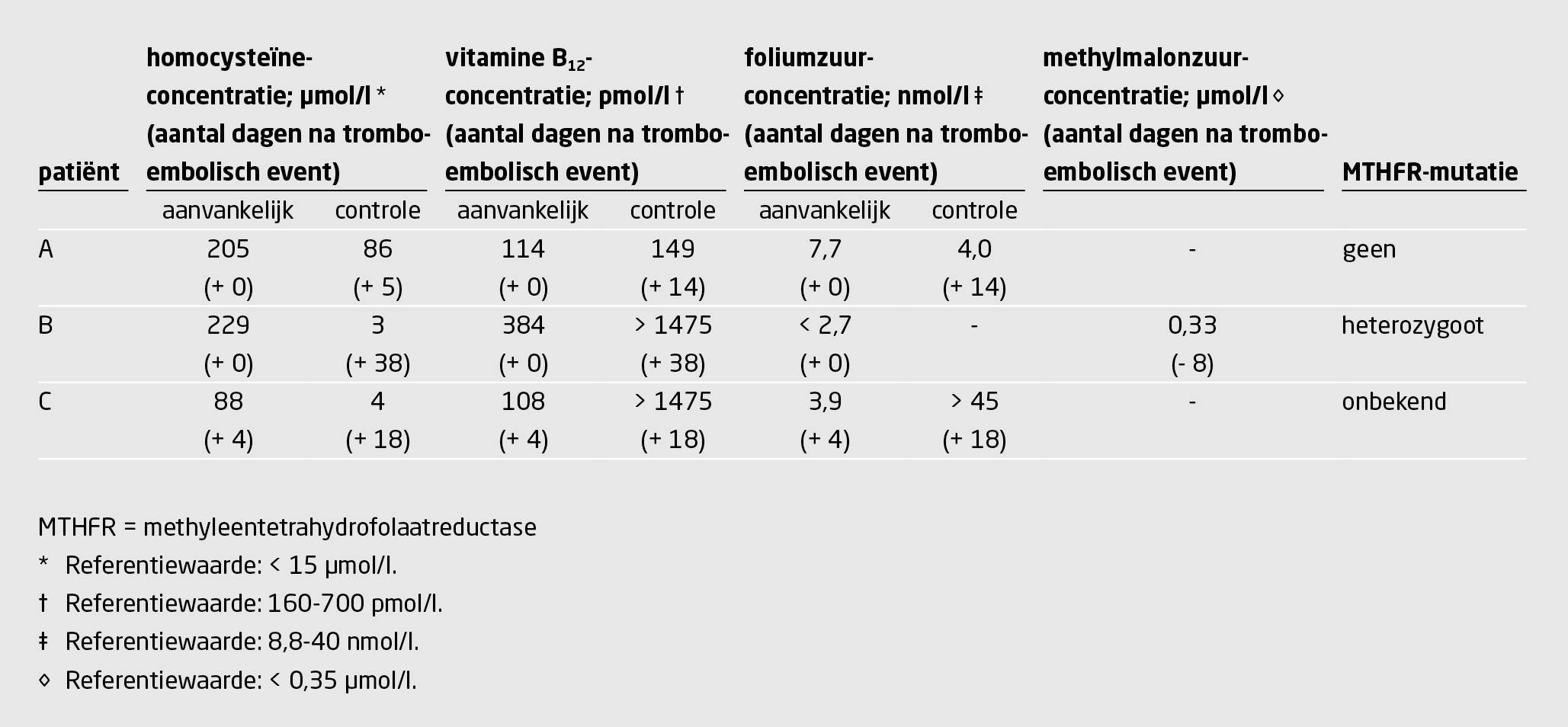 Toxicologische screening van de urine is negatief voor andere drugs, inclusief cocaïne. Het ecg laat een acuut voorwandinfarct zien (figuur 1). Bloedonderzoek toont een homocysteïneconcentratie van 205 μmol/l en vitamine B12-concentratie van 114 pmol/l (tabel 1). Bij coronaire angiografie (CAG) zien wij een trombus proximaal in de ramus interventricularis anterior van de linker coronairarterie (‘left anterior descending artery’; LAD) en een trombotische occlusie distaal in deze arterie (figuur 2a en video 1).