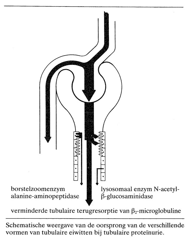 In een menselijke nier kan men vele structuren onderscheiden. Voor een beter begrip van de complexe materie van glomerulaire en tubulaire eiwitten moet men een beeld hebben van een vergroot model van een nefron, de kleinste functionerende eenheid in de nier (figuur). Eenvoudig voorgesteld bestaat een nefron uit een glomerulair en een tubulair gedeelte. In de glomeruli wordt het toegevoerde bloed selectief ontdaan van de stoffen die de glomerulusmembraan passeren; deze stoffen worden in de eerste urine uitgescheiden. Daarna vinden in het tubulaire gedeelte weer actieve resorptie en secretie van veel stoffen plaats.