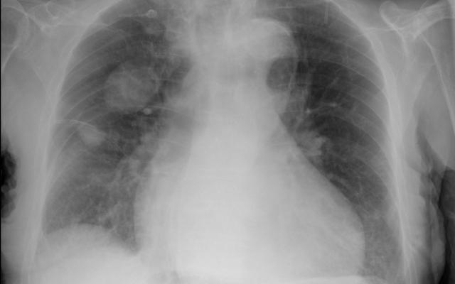 Een 89-jarige man, bekend met cognitieve stoornissen en atriumfibrilleren, werd naar de Spoedeisende Hulp gebracht nadat hij thuis op de grond was aangetroffen. Patiënt zelf had geen klachten. De tractusanamnese leverde geen bijzonderheden op, ook niet op cardiopulmonaal gebied. Bij het lichamelijk onderzoek zagen wij een koortsvrije man met een niet-afwijkende tensie en ademfrequentie. Bij auscultatie van de longen hoorden wij basaal fijne crepitaties over beide longen. Patiënt had pitting oedeem aan beide enkels en een licht verhoogde centraal-veneuze druk. Vanwege de crepitaties lieten wij een thoraxfoto maken (figuur 1). Op de thoraxfoto waren twee bolvormige pulmonale afwijkingen zichtbaar…