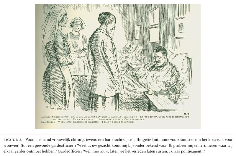 De cartoon (figuur 2) die Gijselhart als voorbeeld van negatieve toonzetting afdrukte in zijn beschouwing over de ontvangst van de vrouw als collega in de medische wereld, heeft mij een tijdje beziggehouden (2008:2191-5). Welke implicaties zijn bedoeld in het dialoogje tussen de vrouwelijke chirurg en de gewonde guardsman? Mijns inziens camoufleert Gijselharts vertaling de meest vileine. Zijn interpretatie suggereert dat de feministische chirurge kennelijk eens door de patiënt in de boevenwagen van een demonstratie verwijderd is, maar in het origineel spreekt hij haar aan met ‘mum’. Is ‘mum’ een variant van het Engelse ‘madam’, zoals de auteur denkt? Collins English dictionary geeft voor ‘mum’ twee betekenissen: kindertaal voor ‘moeder’ (‘mam’) en: obscure biersoort. Implicatie dus: een vrouw die zover van haar lotsbestemming afgedwaald is, is ook als moeder zo ontaard dat ze haar eigen kind niet meer herkent. De guardsman lijkt het verzoenende gebaar te maken. Bedoelt hij te zeggen dat hij ook wel snapt dat een echte feministe haar zoon wel moet ontkennen als deze bij de politie gaat werken? Maar nu is hij in ieder geval gepromoveerd naar de elite van het leger, en wellicht zal dat haar hart doen smelten. Dit alles te lezen met besef van de ‘British stiff upper lip’.