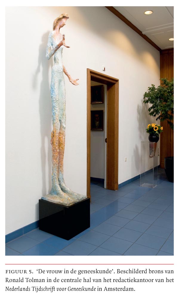 De feminisering is ook niet voorbijgegaan aan de redactie van het Nederlands Tijdschrift voor Geneeskunde, getuige de opdracht voor het beeld ‘De vrouw in de geneeskunde’ bij het begin van het het nieuwe millennium (figuur 5). Deze ‘vamp’ (vrouwelijke arts met de ‘P-factor’: passie, power, pit, panache, prestige, publiciteit, pret, persoonlijkheid, pragmatisme, puurheid en professoraat) staat fier in de centrale hal van het redactiekantoor te Amsterdam. Met het simpele gegeven dat de hoofdredactie van het Tijdschrift zelf nog volledig uit mannen bestaat, ja, daarmee begint een ander verhaal . . .