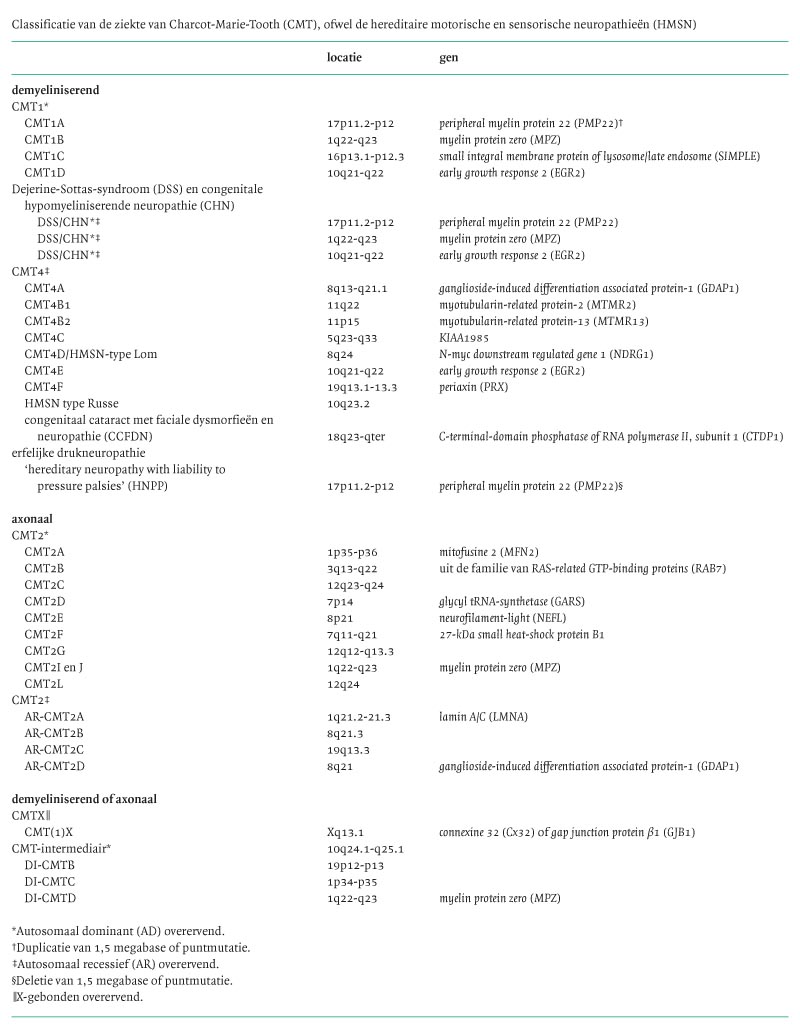 Met elektrofysiologisch geleidingsonderzoek (EMG) van de perifere zenuwen kan een onderscheid gemaakt worden tussen een demyeliniserende en een axonale vorm van CMT (tabel). Bij de demyeliniserende vorm zijn de geleidingssnelheden duidelijk vertraagd. Bij afspraak neemt men een motorische geleidingssnelheid van de N. medianus van 38 m/s…