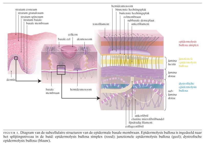 Bij epidermolysis bullosa bestaat de blaarvorming in en rond de basale membraan van de epidermis. De aandoening wordt geclassificeerd in drie categorieën naar het niveau van splijting: (a) epidermolysis bullosa simplex met intra-epidermale splijting door de basale cellen van de epidermis; (b) junctionele epidermolysis bullosa met subepidermale splijting tussen de lamina densa en de basale cellen; en (c) dystrofische epidermolysis bullosa met splijting onder de lamina densa (figuur 1).1 Het niveau van splijting en de genmutatie bepalen de ernst en het beloop van de aandoening. Hierbij kan het gaan van nagelafwijkingen tot pijnlijke mutilaties van huid, ogen, mond, keel, slokdarm en bewegingsapparaat.