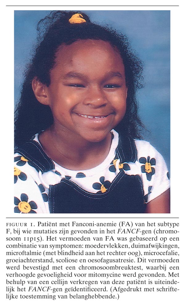Fanconi-anemie (FA) is een autosomaal recessief erfelijke aandoening en wordt gekenmerkt door aangeboren afwijkingen, een verhoogd risico op beenmergfalen (pancytopenie), alsmede een verhoogde kans op maligniteiten. Bij de ‘klassieke’ FA-patiënt ontbreken de duimen en radii en zijn er groeiachterstand, moedervlekken, microftalmie en microcefalie (figuur 1). Tussen het 5e en 10e levensjaar is er progressief verlies van de beenmergfunctie, vaak beginnend met trombocytopenie. De levensverwachting is sterk gereduceerd (gemiddeld tot het 20e jaar; uitersten: 0-50), niet alleen door het beenmergfalen, maar ook door een (circa 1000 maal) verhoogde kans op acute myeloïde leukemie en solide tumoren, met name plaveiselcelcarcinomen (gynaecologische en orofaryngeale). Het beenmergfalen, dat vroeg of laat de meeste patiënten treft, kan tijdelijk worden opgevangen door transfusies of behandeling met androgenen en/of corticosteroïden, maar transplantatie met stamcellen van een verwante of niet-verwante donor is de enige curatieve behandeling voor dit aspect van de ziekte. De…