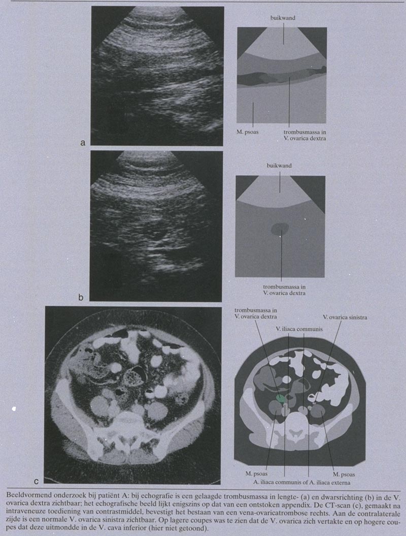 Een 44-jarige vrouw werd opgenomen met koorts en pijn rechts in de onderbuik waarbij gedacht werd aan appendicitis. De diagnose ‘vena-ovaricatrombose’ werd gesteld door middel van echografie en werd bevestigd met een CT-scan van het abdomen met intraveneuze toediening van contrastmiddel. Patiënte werd behandeld met heparine, waarna binnen 72 uur de klachten verdwenen en de temperatuur normaal werd. Herhaald radiologisch onderzoek liet regressie zien van de trombus. Trombose van de V. ovarica is een zeldzame, potentieel letale aandoening, die medicamenteus goed te behandelen is. De hoeksteen van de diagnostiek is niet-invasief radiologisch onderzoek.