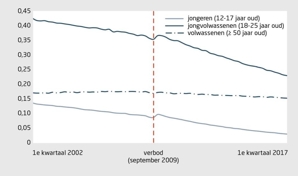 Onder jongeren en jongvolwassenen was er meteen na het verbod op sigaretten met een smaakje een verhoogde kans dat jongeren of jong volwassenen in de afgelopen 30 dagen een sigaret gerookt hadden (respectievelijke oddsratio’s (OR): 1,17; 95%-BI: 1,07-1,29 en OR: 1,09; 95%-BI: 1,03-1,16, zie figuur). Daarna nam deze kans in beide groepen steeds verder af (totale effect jongeren OR: 0,57; 95%-BI: 0,49-0,66, jongvolwassenen OR: 0,73; 95%-BI: 0,66-0,82). In 2017 was de voorspelde waarschijnlijkheid dat een jongere of jong volwassene sigaretten rookte met respectievelijk 43 en 27% afgenomen in vergelijking met de voorspelde waarschijnlijkheid voorafgaand aan het verbod.