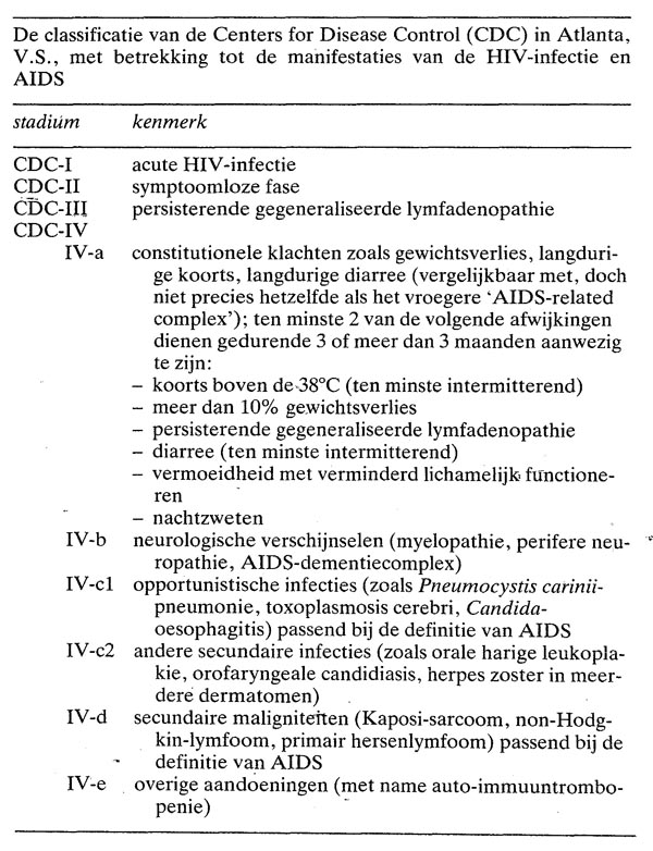 In de afgelopen jaren is het aantal patiënten met een HIV-infectie in Nederland gestaag toegenomen.1 Het is dan ook te verwachten dat bij de uitvoering van de arbeidsongeschiktheidswetten (Algemene Arbeidsongeschiktheidswet (AAW)Wet op de Arbeidsongeschiktheidsverzekering (WAO)) de verzekeringsgeneeskundige op zijn spreekuur in toenemende mate te maken krijgt met werknemers die geheel of gedeeltelijk arbeidsongeschikt raken door de gevolgen van de HIV-infectie. Hierbij wordt niet alleen gedoeld op de arbeidsongeschiktheid door de gevolgen van de ziekte op somatisch gebied, maar ook op de gevolgen op psychisch en sociaal-maatschappelijk gebied. De eventuele arbeidsongeschiktheid geldt overigens voor alle stadia van de infectie; de meest gebruikte indeling voor patiënten met een HIV-infectie is die in 4 stadia, gedefinieerd door de Centers for Disease Control (CDC) te Atlanta in de V.S. (tabel). Stadiëring van de ziekte bij patiënten is van belang voor de behandelingsstrategie, voor onderlinge vergelijkbaarheid van patiënten bij onderzoek…