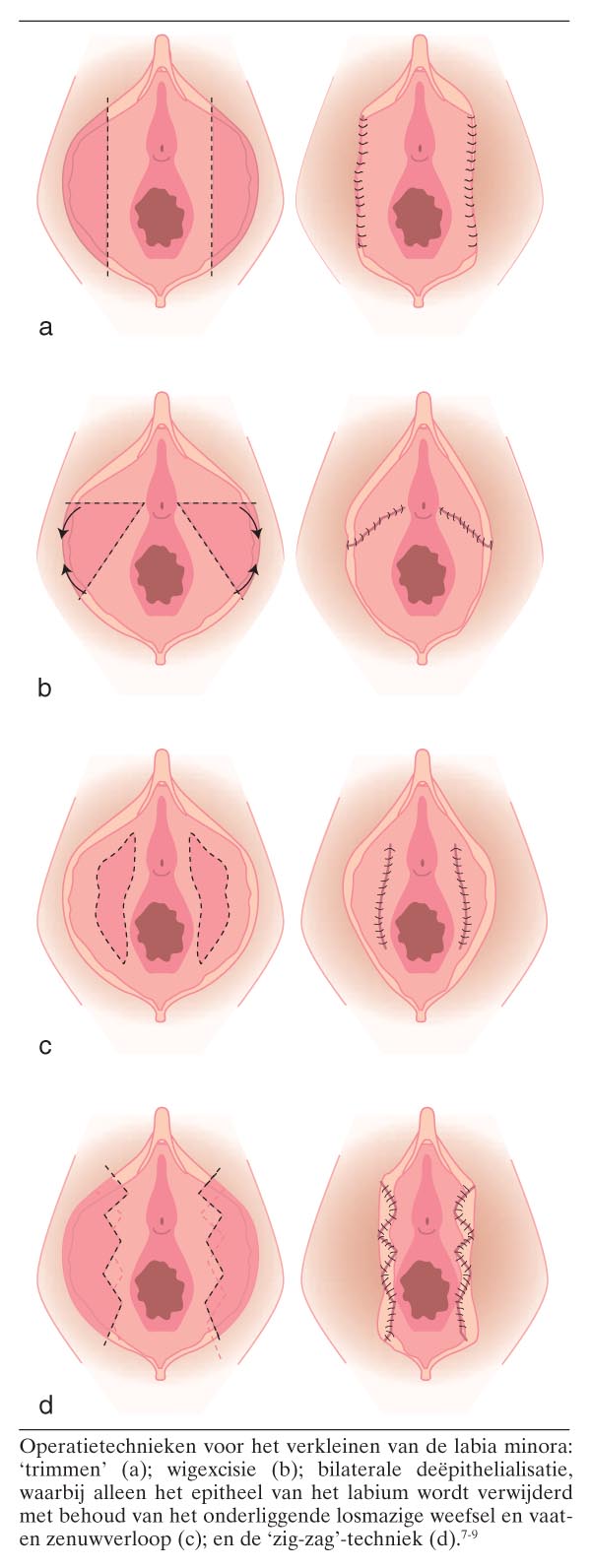 Voor het verkleinen van de labia minora zijn er verschillende technieken (figuur). Bij amputeren of ‘trimmen’ wordt het overmatige, buitenste deel van de labia verwijderd. Om cosmetische redenen wordt een wigexcisie aanbevolen, waarmee de natuurlijke contour en vooral de pigmentatie van de vrije rand van het labium beter behouden blijven.7 Een gedeëpithelialiseerde labiumplastiek spaart de neurovasculaire voorziening van de vrije rand van het labium.8 Recent is een w-vormige labiumresectie (ook wel ‘zig-zag’-techniek) beschreven om klachten op basis van littekencontractie te voorkomen.9