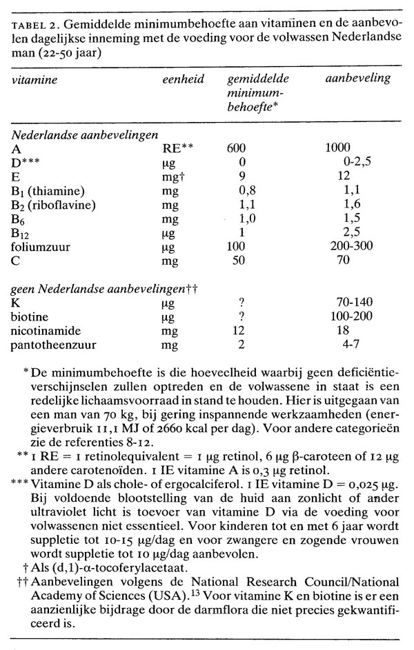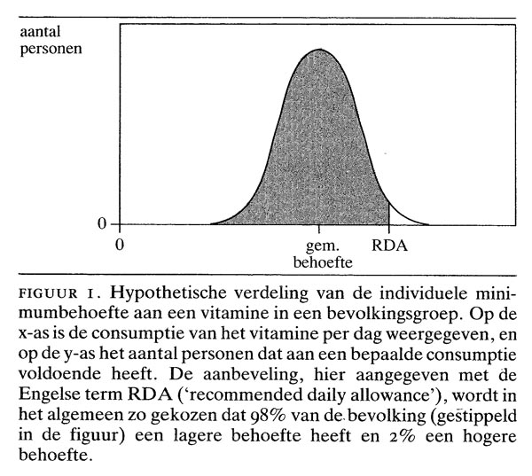 De hoeveelheid die een gezond individu van een bepaalde vitamine nodig heeft voor normale stofwisselingsfuncties noemt men zijn of haar minimumbehoefte. Deze hoeveelheid is niet voor iedereen gelijk. Als gevolg daarvan bestaat er binnen de bevolking en zelfs binnen elke bevolkingscategorie een scala aan minimumbehoeften (figuur 1). Deze scala kan worden gekarakteriseerd door de gemiddelde minimumbehoefte en de standaardafwijking van dat gemiddelde. De hoeveelheid van een vitamine die vrijwel alle personen in die groep (98) in staat stelt om een goede gezondheid te handhaven, is de gemiddelde minimumbehoefte verhoogd met tweemaal de standaardafwijking van dat gemiddelde. Voor de vitaminen worden op deze wijze de zogenaamde aanbevolen hoeveelheden verkregen zoals die voor de Nederlandse situatie worden vastgesteld door de Voedingsraad.8-12 In de praktijk is de verdeling van de behoeften vaak niet exact bekend; de aanbeveling wordt dan verkregen door de minimumbehoefte te verhogen met een marge die geacht wordt de voorkomende variaties in behoefte goeddeels te dekken. Tabel 2 toont de gemiddelde minimumbehoefte en de aanbevolen hoeveelheden van een aantal vitaminen voor de Nederlandse volwassen man. Deze verzameling van aanbevelingen vormt de best beschikbare vaststelling van een veilige en adequate inneming.