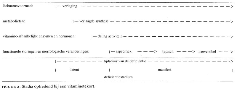 Indien onvoldoende hoeveelheden van een vitamine beschikbaar komen voor het lichaam ontstaat een tekort; daarbij kunnen twee fases worden aangegeven (figuur 2).1415