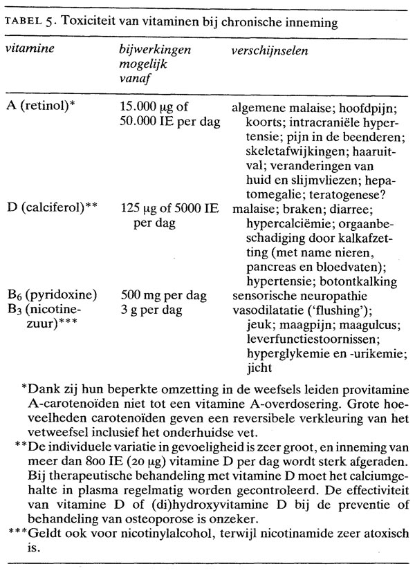 Vitaminen kunnen dus toxische verschijnselen veroorzaken indien ze worden ingenomen in hoeveelheden die aanzienlijk hoger zijn dan die geleverd door de gebruikelijke voeding. De verhouding tussen de aanbeveling en de toxische dosis verschilt sterk tussen de verschillende vitaminen; zo kan vitamine D al toxisch zijn vanaf 25 µg (1000 IE) per dag. Bovendien kunnen hoge doseringen aan vitaminen het normale metabolisme verstoren en een invloed uitoefenen op het therapeutische effect van bepaalde geneesmiddelen. Overgevoeligheid voor vitaminen is zeldzaam, maar bestaat wel. Het veilige niveau van inneming varieert ook met de leeftijd, en met de gezondheid en de fysiologische toestand van het individu. In de praktijk zijn vooral hoge doseringen van vitamine A, B6, D en nicotinezuur niet zonder risico. Tabel 5 geeft aan bij welke niveaus van inneming van deze vitaminen neveneffecten zijn te verwachten.