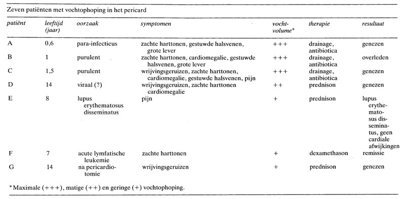 In bovenstaand citaat uit ‘The House at Pooh Corner’ wijst Eeyore ons op de wenselijkheid om in bepaalde situaties meerdere mogelijkheden te overwegen.1 De waarde van dit advies trof ons toen wij recentelijk, in een korte periode, 7 kinderen zagen met een vochtophoping in het pericard. Vochtophoping in het pericard kent veel oorzaken en verschijningsvormen; herkenning van de afwijking is belangrijk omdat niet zelden, na het stellen van de diagnose, binnen de kortste keren drainage moet plaatsvinden om een dodelijke harttamponade te voorkomen.2 Een aantal essentiële kenmerken van de ziektegeschiedenis van de 7 patiënten hebben wij samengevat in tabel 1. Het pericard kan zijn aangedaan bij infecties, lupus erythematosus disseminatus, leukemie en…