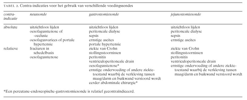 Tot slot zij opgemerkt dat een voedingssonde een (in principe tijdelijk) hulpmiddel is om te voorzien in een primaire levensbehoefte tijdens een periode van ziekte of bij chronisch onvermogen tot eten. Dit impliceert dat herstel van de patiënt verwacht wordt of dat de sonde dient ter verbetering van de kwaliteit van leven van een chronisch zieke patiënt. Voor de patiënt met uitzichtloos lijden is het gebruik van een voedingssonde gecontraïndiceerd, omdat hiermee door kunstmatig ingrijpen een leven wordt gerekt (tabel 2). Ondanks dit ethische dilemma is een voedingssonde vaak een eenvoudig hulpmiddel dat wezenlijk kan bijdragen aan de substantiële verbetering van de gezondheid van de patiënt en diens kwaliteit van leven.