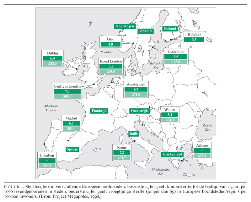 Volksgezondheid in Londen. - Londen is de ongezondste hoofdstad van West-Europa. De sterftecijfers daar overtreffen zelfs die in traditioneel arme steden als Rome en Athene (figuur 1). Dit blijkt uit de eerste resultaten van een vorig jaar door de Europese Unie begonnen grootschalig vergelijkend onderzoek naar de gezondheidstoestand…