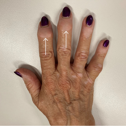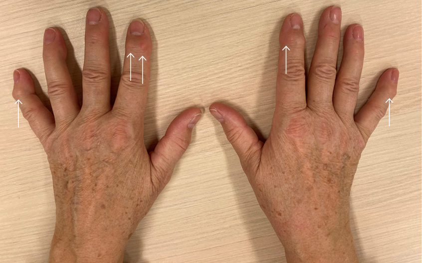 Bij gewrichtsonderzoek blijft de pink achter in vuistsluiting. Er is een benige zwelling van de DIP-gewrichten van de wijs- en middelvinger. Het PIP-gewricht van de rechter pink is synoviaal gezwollen. Aan de polsen en MCP-gewrichten heeft de patiënte geen afwijkingen (figuur 3).