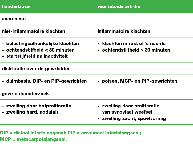 De onderscheidende kenmerken van handartrose en reumatoïde artritis staan samengevat in de tabel.