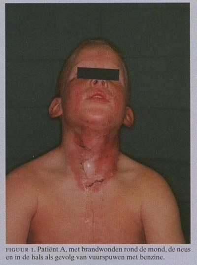 Patiënt A, een 9-jarige jongen, deed zo nu en dan circusacts. Het staande rijden op twee pony's beheerste hij al. Voor een komend feest wilde hij een nieuwe act laten zien en hij koos daarvoor vuurspuwen. Dit moest een grote verrassing worden voor zijn ouders en dus overlegde hij niet met hen. Tijdens het oefenen met benzine ontstond er een steekvlam, waardoor patiënt brandwonden in het gelaat opliep. Via de waarnemend huisarts werd hij naar ons Centrum doorgestuurd.