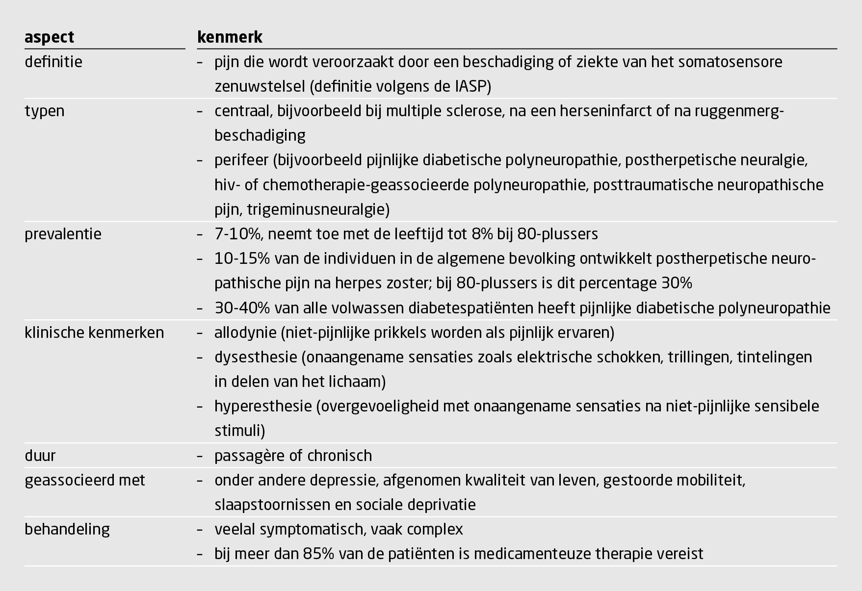 Chronische neuropathische pijn heeft vaak een grote impact op de kwaliteit van leven.1 Tabel 1 geeft een overzicht van de kenmerken van neuropathische pijn. De behandelstrategie moet multifactorieel zijn, waarbij niet-farmacologische interventies worden gecombineerd met medicamenteuze therapie met antineuropathica, zoals antidepressiva of gabapentinoïden. De respons op medicamenteuze behandeling is vaak echter matig,2,3 en het effect kan enkele weken op zich laten wachten, terwijl de patiënt vanaf de introductie van het middel wordt blootgesteld aan de negatieve effecten. Bijna twee derde van de gebruikers ervaart bijwerkingen van deze medicamenteuze therapie,2,3 zoals slaperigheid en duizeligheid.