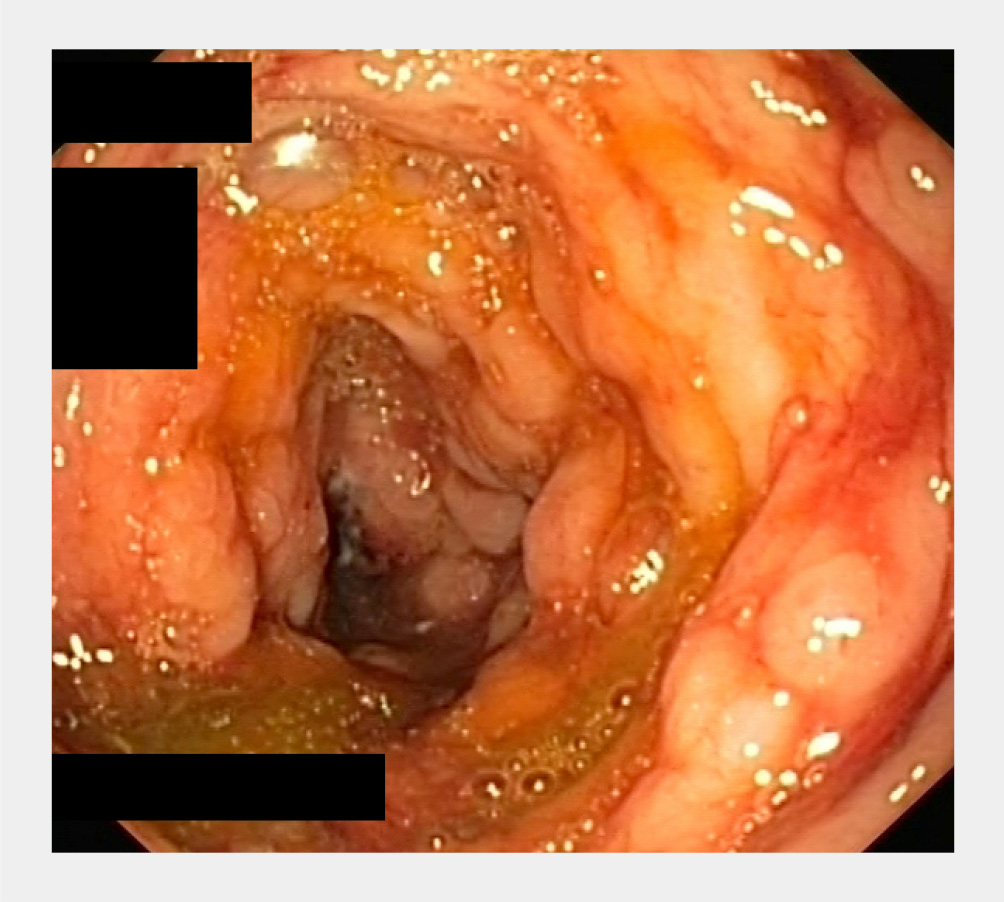 Tijdens vakantie in Spanje, 2 maanden geleden, had hij last gekregen van buikpijn en bloedverlies per anum. Een CT-onderzoek ter plaatse had een verdikking van het colon ascendens getoond. Endoscopisch waren enkele kleine ulcera gezien; histopathologisch onderzoek van biopten hieruit toonde een ontstekingsbeeld zonder tekenen van dysplasie. De behandelende arts in Spanje had amoebiasis als oorzaak van de klachten overwogen en een kuur metronidazol voorgeschreven. Er was een goede klinische respons en de patiënt was teruggereisd naar Nederland. Na terugkomst had hij opnieuw buikpijn en diarree gekregen, waarop de huisarts hem naar onze polikliniek had verwezen.