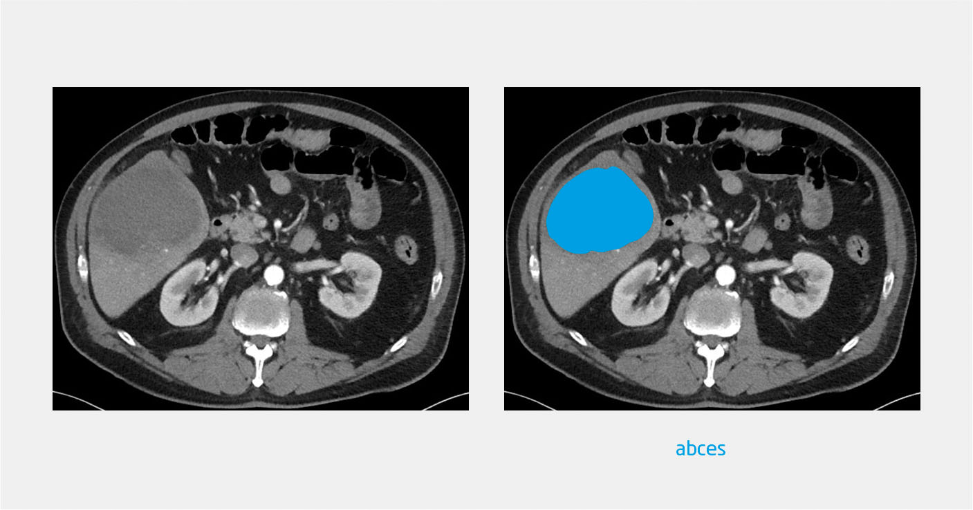 CT van het abdomen toonde een grote afwijking in de lever, verdacht voor abces (figuur 2). Op empirische gronden kreeg de patiënt amoxicilline/clavulaanzuur (1200 mg 4 dd iv) voorgeschreven, gecombineerd met ciprofloxacine (400 mg 2 dd iv). Bij drainage van het abces werd bruin, stroperig vocht geaspireerd. Vanwege dit aspect – ‘ansjovispasta’ genoemd – in combinatie met de reisanamnese overwogen wij de diagnose ‘ E. histolytica -infectie. Aanvullend microscopisch onderzoek en PCR van het abcesvocht en PCR op de feces bevestigden deze diagnose. De behandeling werd voortgezet in de vorm van metronidazol (750 mg 3 dd gedurende 7 dagen), gevolgd door clioquinol 250 mg 3 dd gedurende 10 dagen, waarna de patiënt klachtenvrij werd.