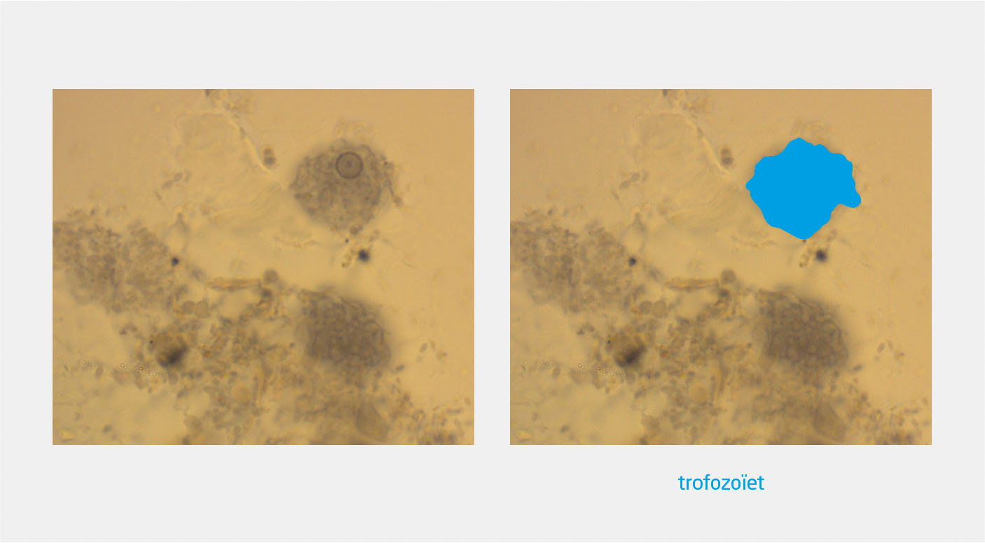 Gezien de bevindingen en het risicogedrag van de patiënt op zijn reizen werd aanvullende hiv-diagnostiek ingezet, waaruit bleek dat de patiënt hiv-positief was (CD4-getal: 550/mm3). Aangezien de patiënt 6 maanden voor zijn reis nog een coloscopie had ondergaan, werden de biopten gereviseerd. Met histologisch onderzoek en PCR konden wij echter ook retrospectief geen amoebeninfectie aantonen.