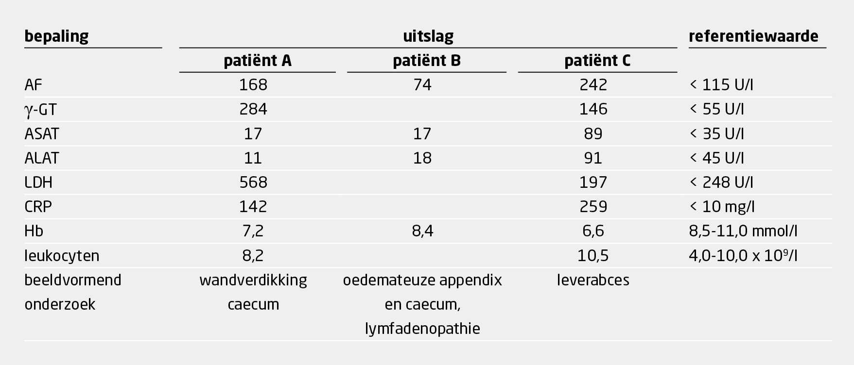 Bij lichamelijk onderzoek was de buik drukpijnlijk. Laboratoriumonderzoek toonde cholestatische afwijkingen van de leverenzymen en een verhoogde CRP- en LDH-waarde (tabel). CT-onderzoek toonde aanwijzingen voor ontsteking ter plaatse van het coecum.