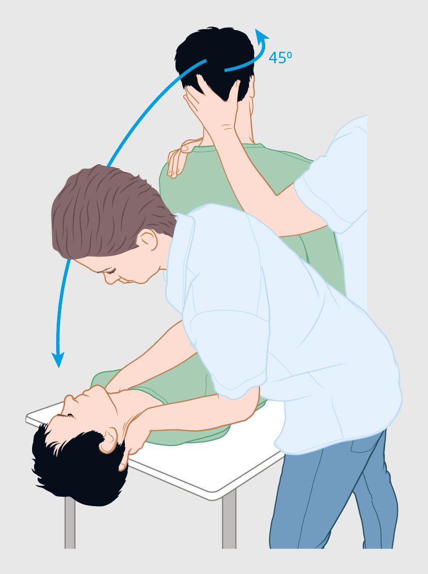 De diagnose ‘BPPD van het posterieure semicirculaire kanaal’, de meest voorkomende variant van BPPD, wordt definitief gesteld met de provocatieproef van Dix-Hallpike (gemiddelde sensitiviteit: 80%).15-17 Hierbij wordt bij de patiënt in zittende houding het hoofd 45º naar rechts of naar links gedraaid, waarna de patiënt snel op zijn rug wordt gelegd met het hoofd in iets afhangende stand (figuur 1).18 De Dix-Hallpike-manoeuvre is positief wanneer na een latentieperiode van enkele seconden draaiduizeligheid ontstaat én een nystagmus wordt opgewekt die eerst toeneemt en binnen 60 seconden verdwijnt.