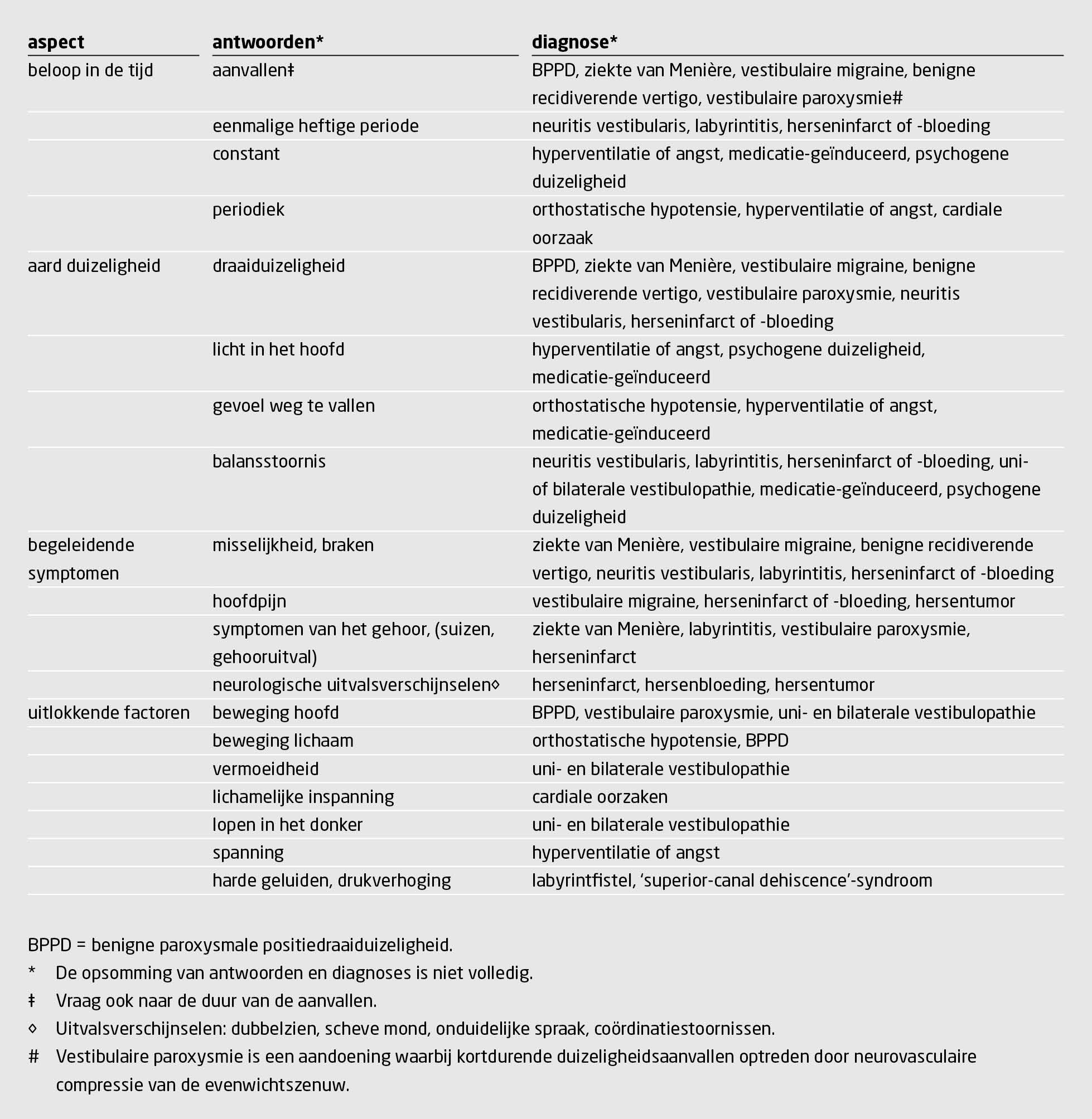 In de spreekkamer, in de niet-acute setting, berust de diagnose bij de klacht duizeligheid voor het grootste gedeelte op de anamnese. Besef dat er vaak (tot 30%) 2 en soms zelfs meer diagnoses naast elkaar kunnen zijn. De tweede diagnose betreft vaak een angststoornis.12 Vraag de volgende items uit (tabel 2):