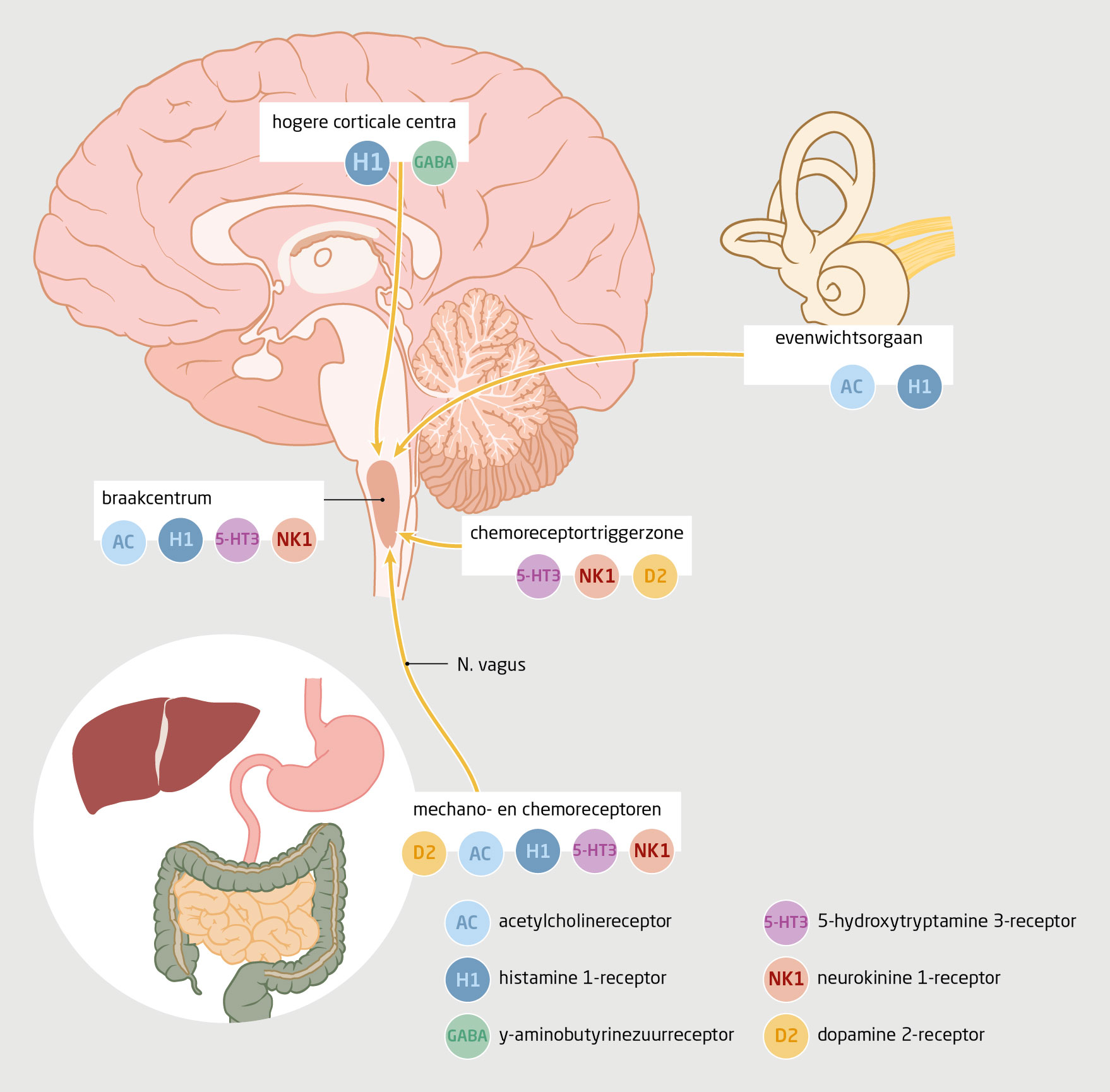 Misselijkheid kan worden opgewekt door visuele, auditieve, gustatorische (smaak) en olfactorische (geur) stimuli. Misselijkheid treedt op door activatie van het braakcentrum in de hersenstam via: (a) perifere stimulatie van chemo- en mechanoreceptoren in maag, darm, lever, serosa en andere viscera (via de N. vagus); (b) centrale stimulatie van receptoren in de chemoreceptortriggerzone – gelegen in de hersenstam, maar buiten de bloed-hersenbarrière – door onder andere geneesmiddelen, toxines en elektrolytstoornissen; (c) stimulatie vanuit het evenwichtsorgaan; of (d) stimulatie vanuit hogere corticale centra. Bij deze processen zijn verschillende neurotransmitters en receptoren betrokken, die tevens als aangrijpingspunten fungeren voor geneesmiddelen (figuur).5,6