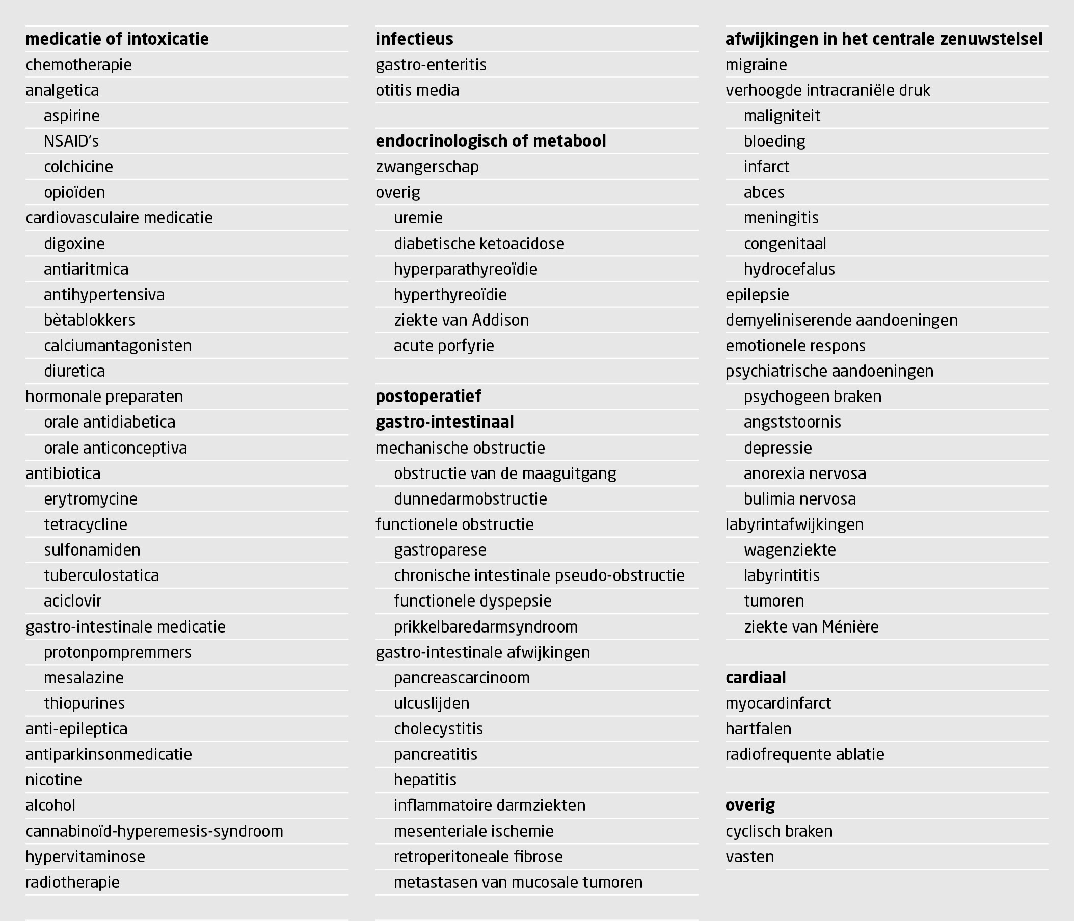 Geneesmiddelen die net als chemotherapie frequent gepaard gaan met misselijkheid, zijn: analgetica (aspirine, NSAID’s en opioïden), cardiovasculaire medicatie (digitalis en antiaritmica), antibiotica, antiparkisonmedicatie en gastro-intestinale medicatie (protonpompremmers en thiopurines) (zie de tabel).7