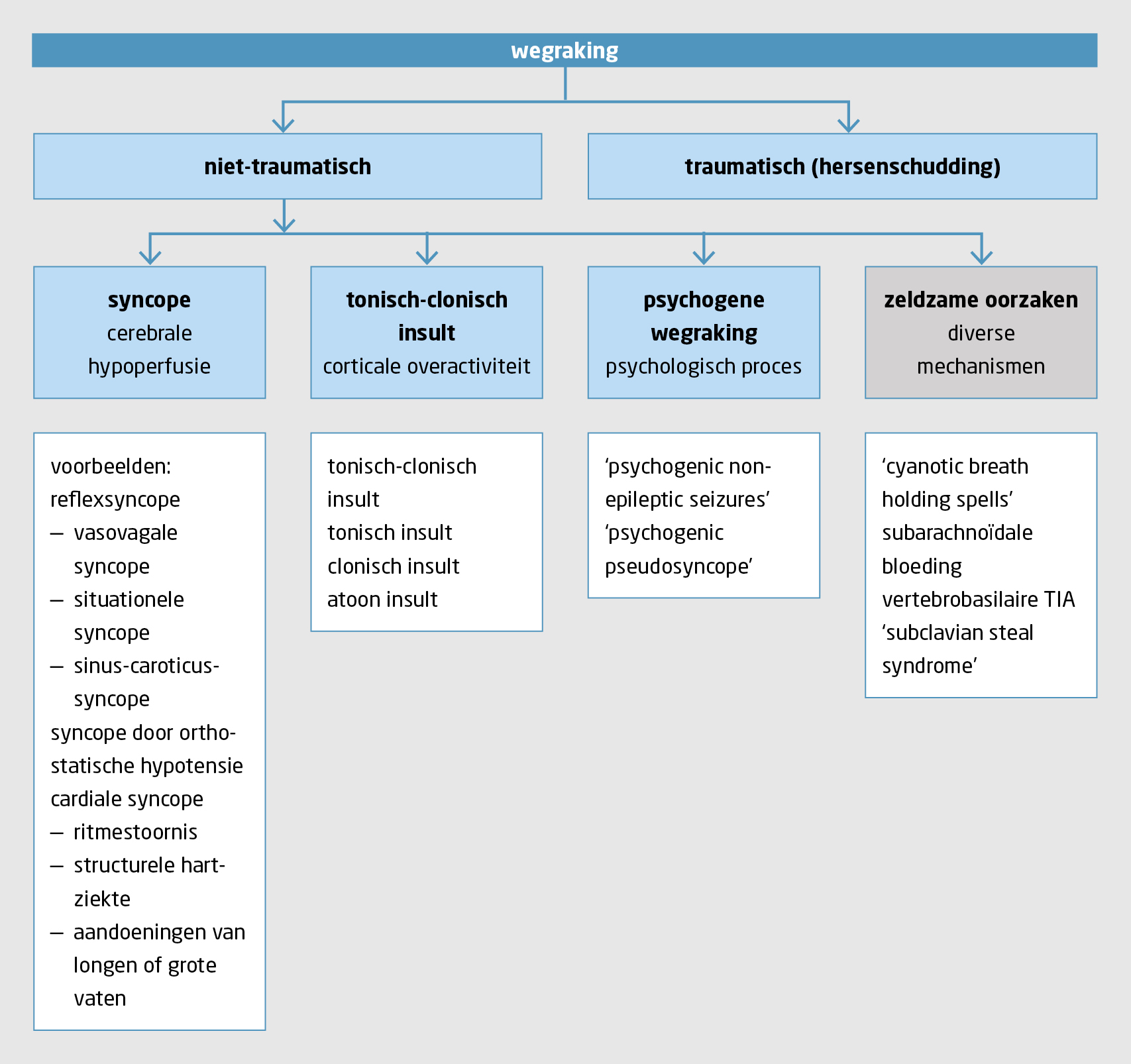 Wegrakingen zijn in het algemeen het gevolg van cerebrale hypoperfusie (syncope), overmatige corticale excitatie (epilepsie) of psychologische processen. Figuur 2 toont de classificatie van wegrakingen.