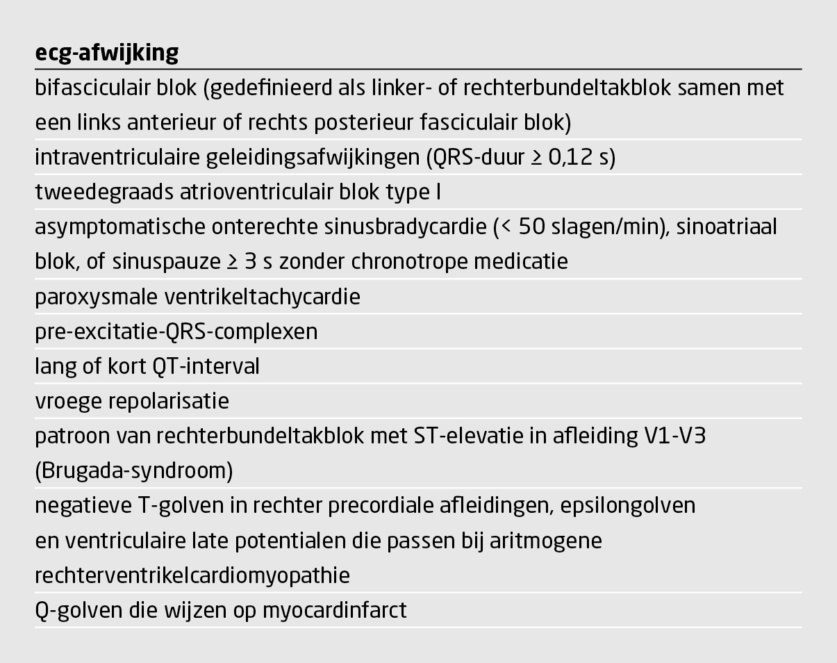 Figuur 3 geeft aanwijzingen aan de hand waarvan onderscheid gemaakt kan worden tussen een relatief onschuldige vasovagale syncope en een potentieel levensbedreigende cardiale syncope; in aanvulling hierop geeft tabel 1 een overzicht van ecg-afwijkingen die wijzen op cardiale syncope.